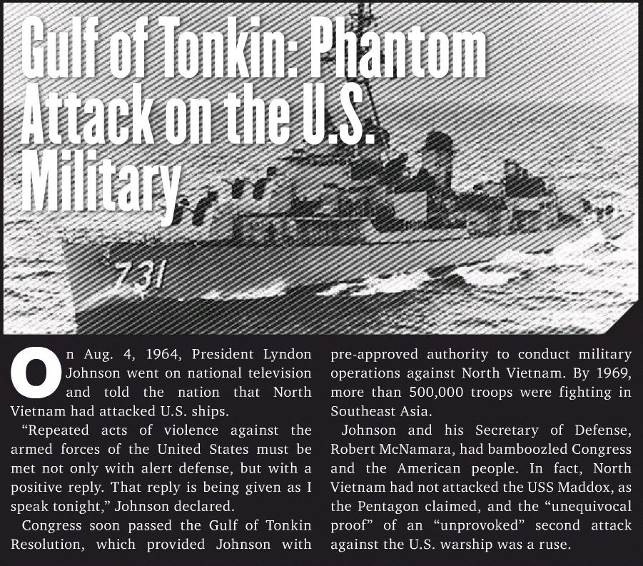 For instance, the ‘Gulf of Tomkin’ incident was probably the tipping point that committed the USA to war in Vietnam in 1964. North Vietnamese motor torpedo boats are meant to have engaged American ships in the Gulf of Tomkin whereas there are other claims that these were not NVA’s craft but American. A more mainstream explanation to the illusion is that there was a ‘communication error’ by the Americans which stands out as being vague at best and unforgiveable at worst. In all cases, unforgiveable.